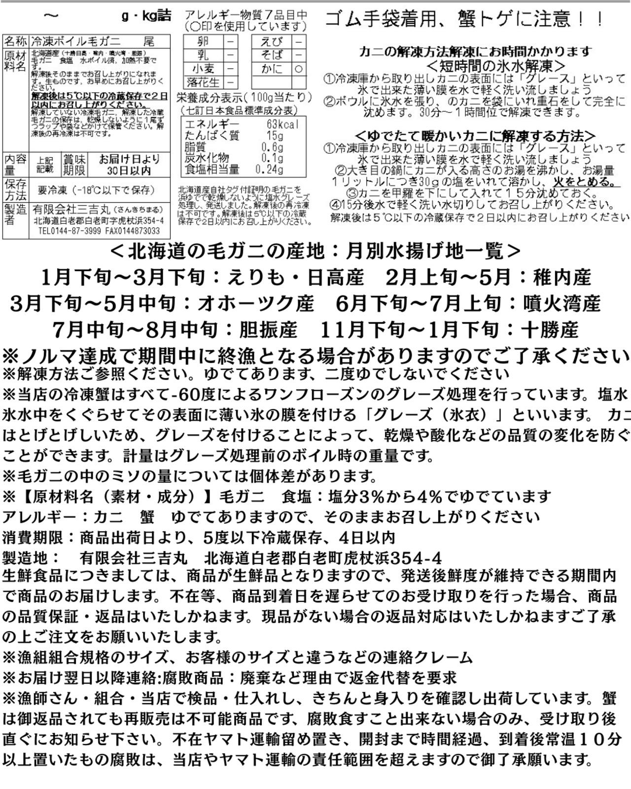 自社製品の証明『三吉丸毛ガニタグ付』が一尾一尾についております。