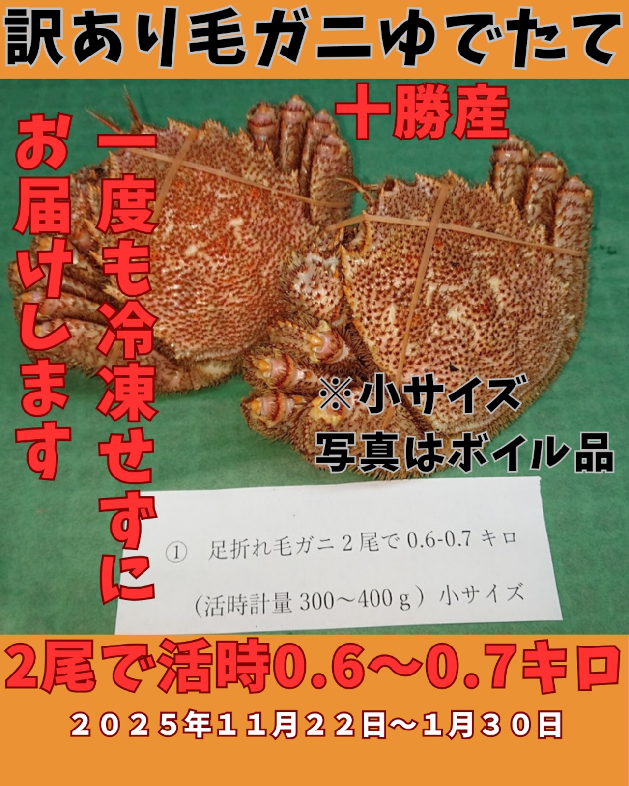 朝ゆで訳あり毛ガニ2尾で0.6〜0.7キロ(活時計量300-350g前後)尾数指定不可