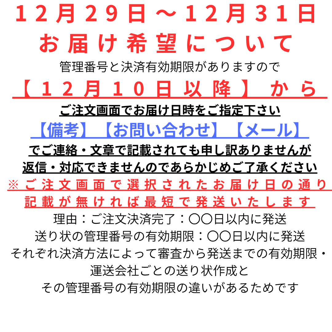 ※お届け日時指定:荷物のお届け到着日時指定は受付することができません。